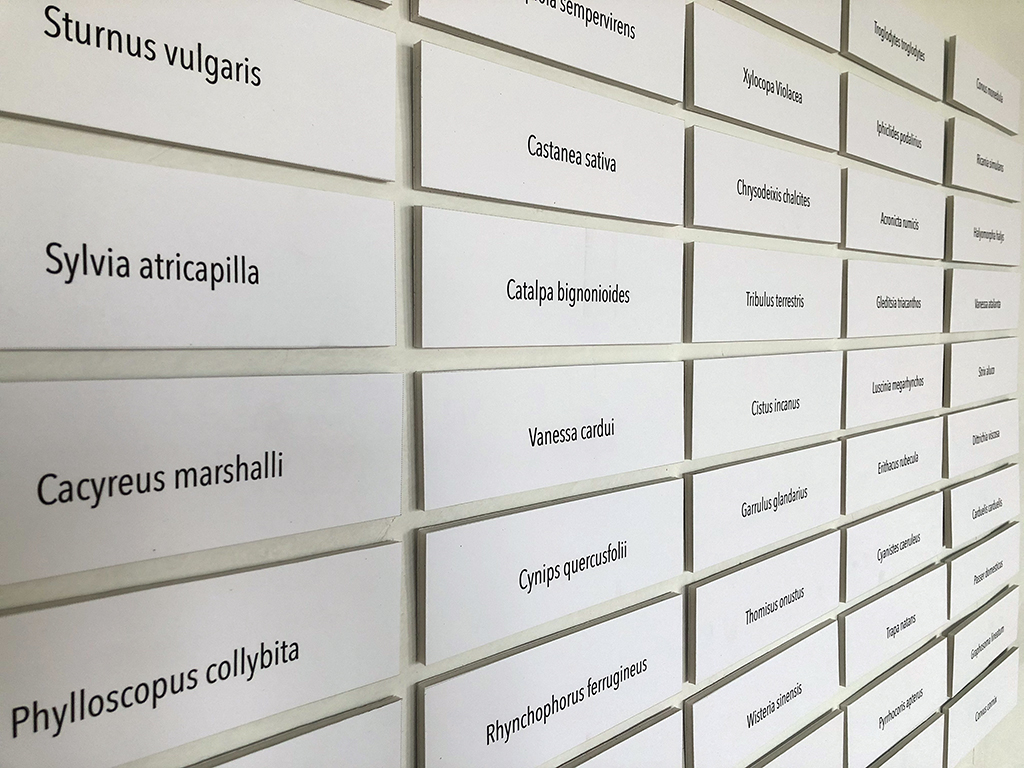 Bu yerleştirmede, sergiye konu olan canlı türlerinin bilimsel taksonomideki Latince adlarından oluşan etiketler, bir grid yapısında duvarda sergileniyor.